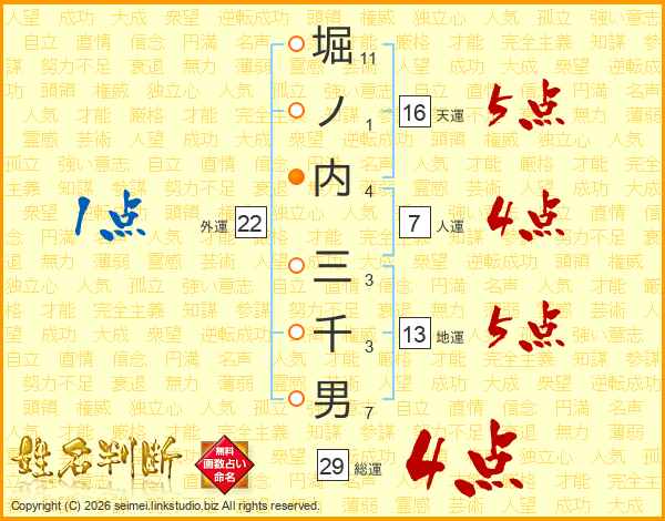 堀(11画)ノ(1画)内(4画) 三(3画)千(3画)男(7画)