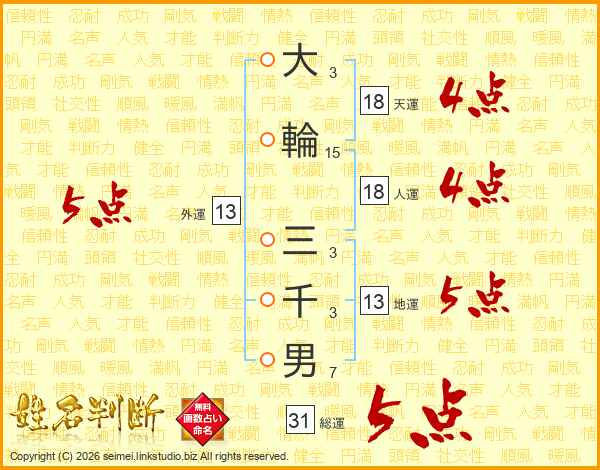 大(3画)輪(15画) 三(3画)千(3画)男(7画)