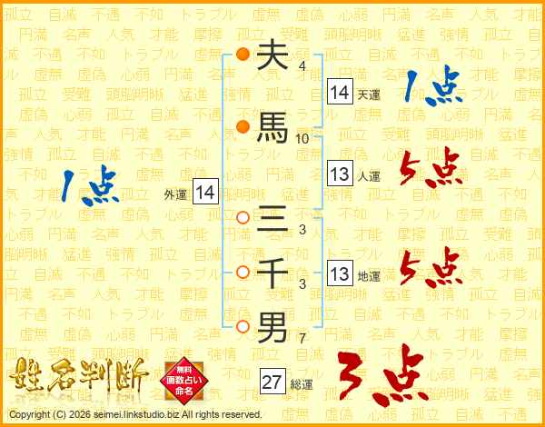 夫(4画)馬(10画) 三(3画)千(3画)男(7画)