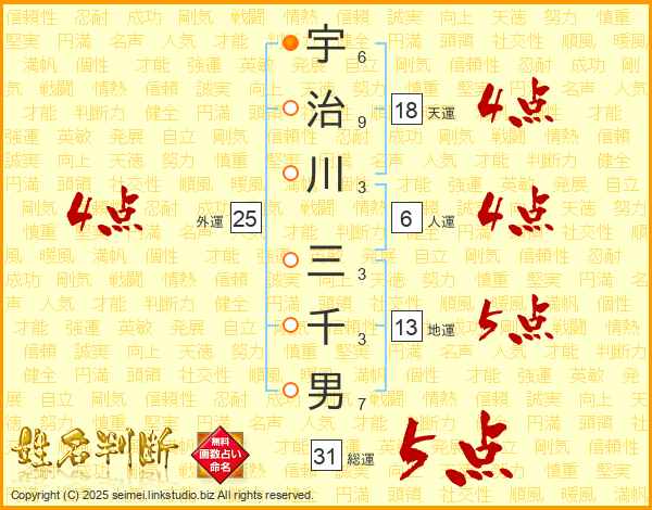 宇(6画)治(9画)川(3画) 三(3画)千(3画)男(7画)