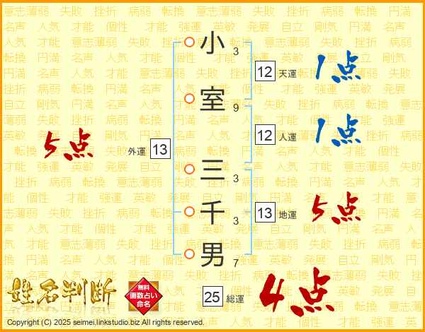 生活面を象徴する運勢です。外部から受ける影響力を表し、結婚運、家庭運や職場、環境への順応性を表します。総運から人運を引いた画数。姓や名が1文字の場合を除く。