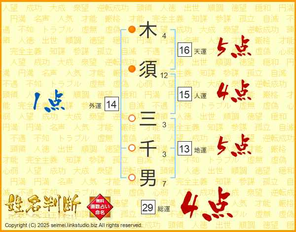 木(4画)須(12画) 三(3画)千(3画)男(7画)
