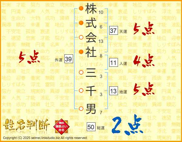株(10画)式(6画)会(13画)社(8画) 三(3画)千(3画)男(7画)