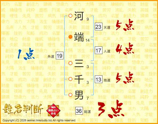 生活面を象徴する運勢です。外部から受ける影響力を表し、結婚運、家庭運や職場、環境への順応性を表します。総運から人運を引いた画数。姓や名が1文字の場合を除く。