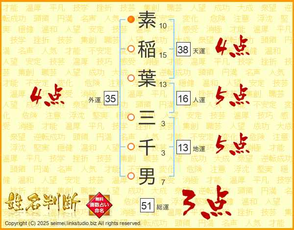 素(10画)稲(15画)葉(13画) 三(3画)千(3画)男(7画)