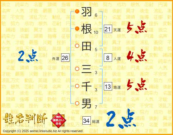 羽(6画)根(10画)田(5画) 三(3画)千(3画)男(7画)