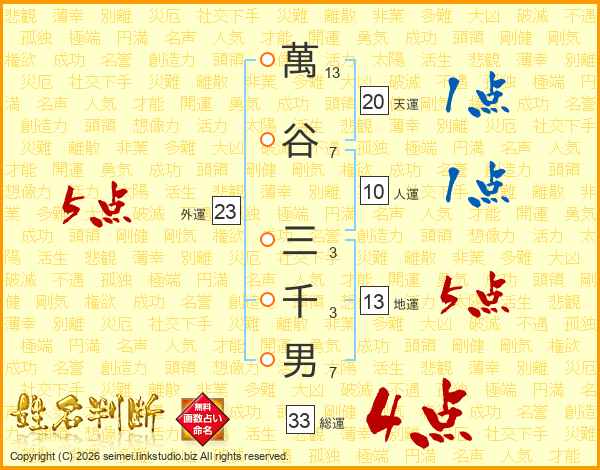 萬(13画)谷(7画) 三(3画)千(3画)男(7画)