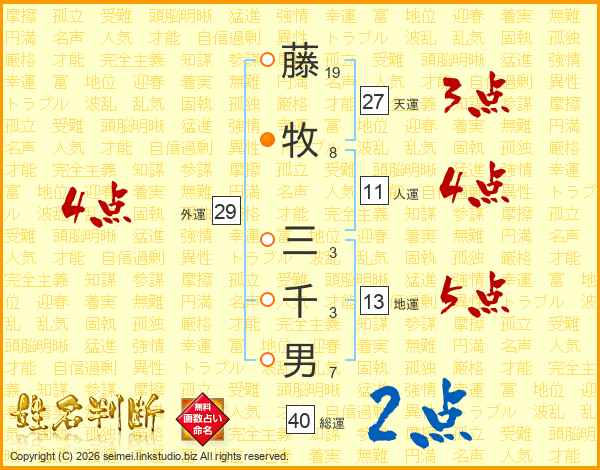 藤(19画)牧(8画) 三(3画)千(3画)男(7画)