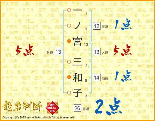 一(1画)ノ(1画)宮(10画) 三(3画)和(8画)子(3画)