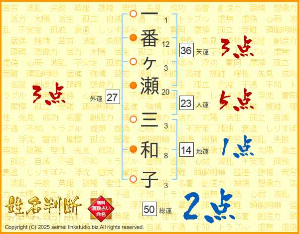 一番ヶ瀬三和子さんの総運は50画の2点!