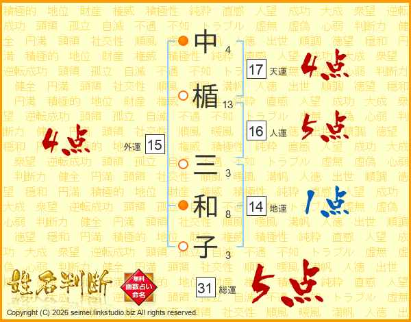 生活面を象徴する運勢です。外部から受ける影響力を表し、結婚運、家庭運や職場、環境への順応性を表します。総運から人運を引いた画数。姓や名が1文字の場合を除く。
