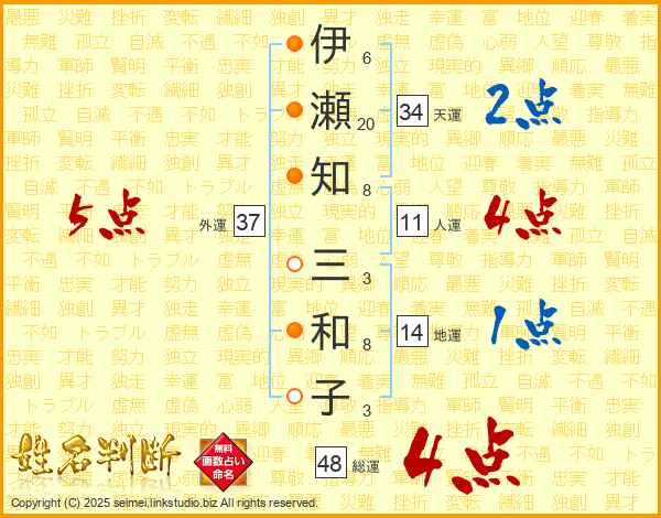 伊(6画)瀬(20画)知(8画) 三(3画)和(8画)子(3画)