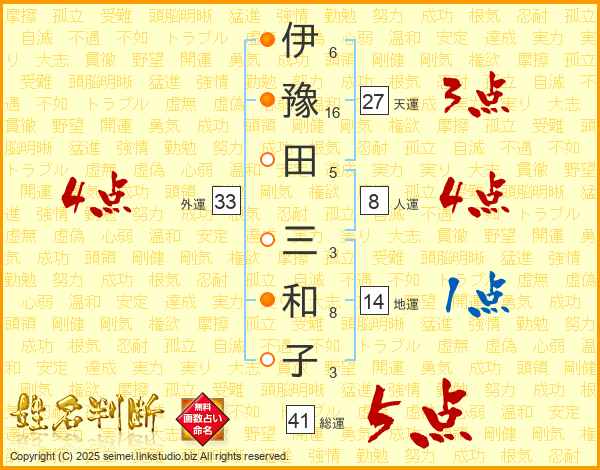 伊(6画)豫(16画)田(5画) 三(3画)和(8画)子(3画)