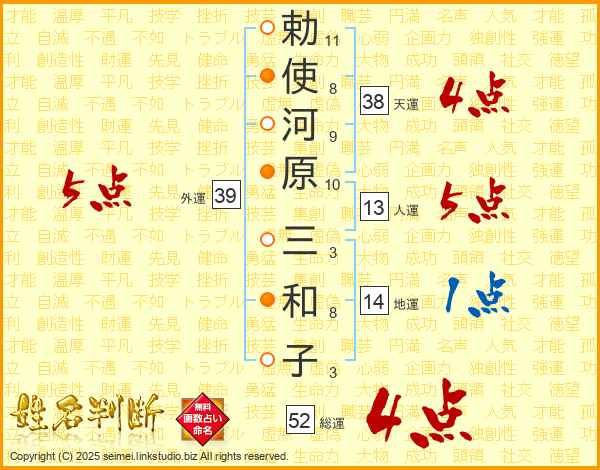 勅(11画)使(8画)河(9画)原(10画) 三(3画)和(8画)子(3画)