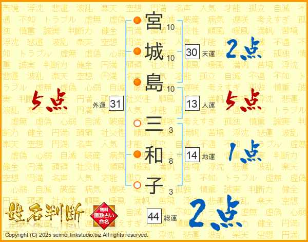 宮(10画)城(10画)島(10画) 三(3画)和(8画)子(3画)