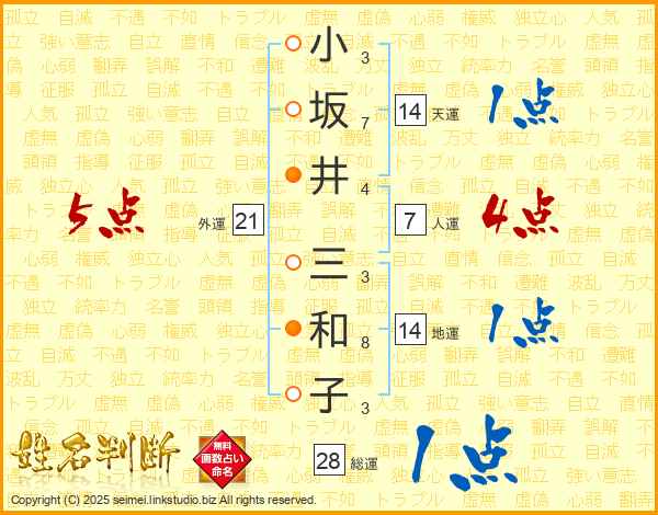 小(3画)坂(7画)井(4画) 三(3画)和(8画)子(3画)