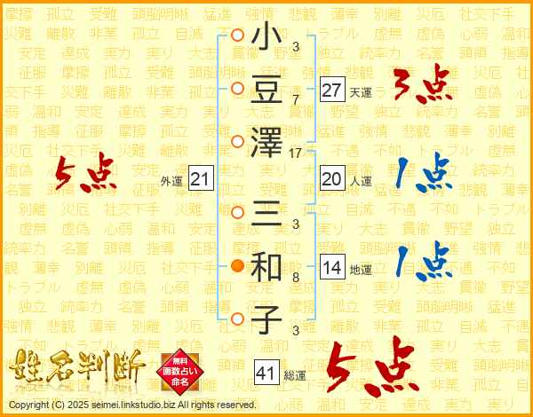 小(3画)豆(7画)澤(17画) 三(3画)和(8画)子(3画)