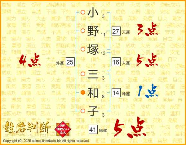 小野塚三和子さんの総運は41画の5点!