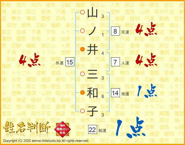山(3画)ノ(1画)井(4画) 三(3画)和(8画)子(3画)