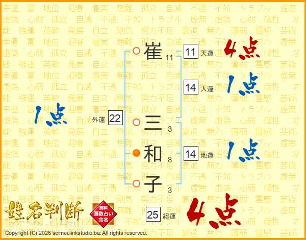 生活面を象徴する運勢です。外部から受ける影響力を表し、結婚運、家庭運や職場、環境への順応性を表します。総運から人運を引いた画数。姓や名が1文字の場合を除く。
