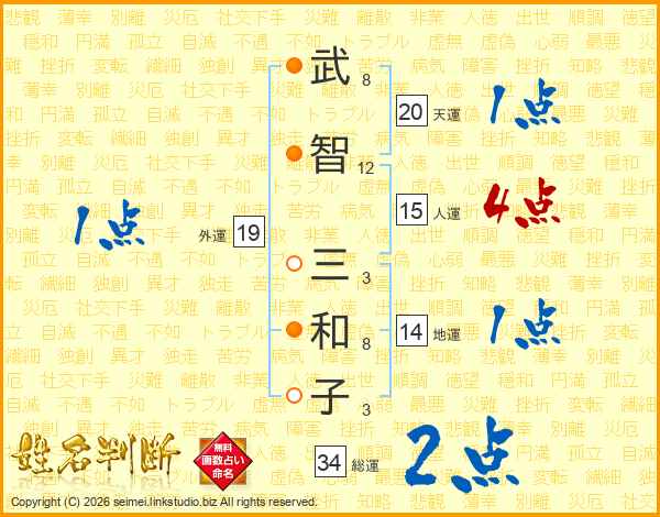 武(8画)智(12画) 三(3画)和(8画)子(3画)