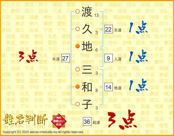 渡(13画)久(3画)地(6画) 三(3画)和(8画)子(3画)