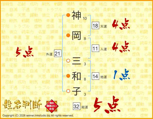 神(10画)岡(8画) 三(3画)和(8画)子(3画)