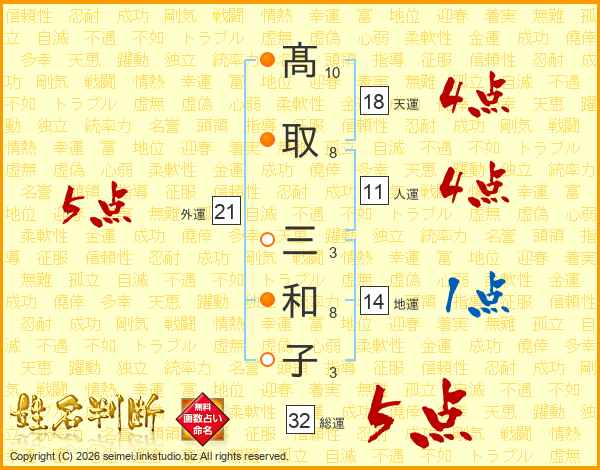 髙取三和子さんの総運は32画の5点!