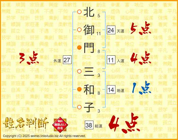 北(5画)御(11画)門(8画) 三(3画)和(8画)子(3画)