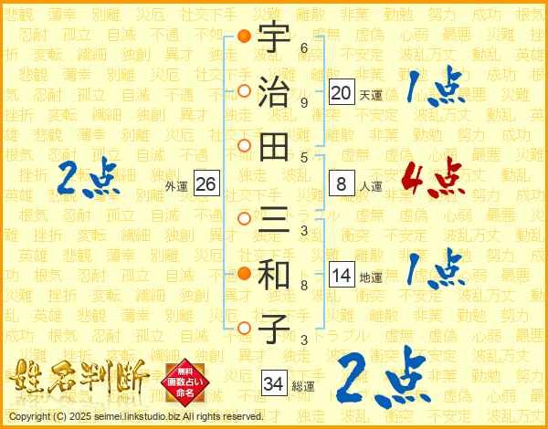 宇(6画)治(9画)田(5画) 三(3画)和(8画)子(3画)