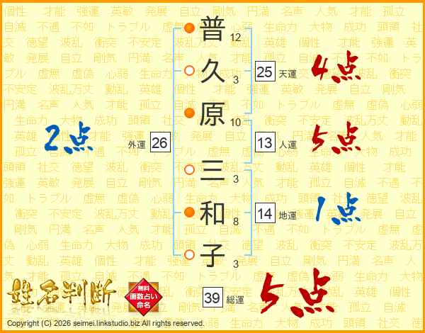 普(12画)久(3画)原(10画) 三(3画)和(8画)子(3画)
