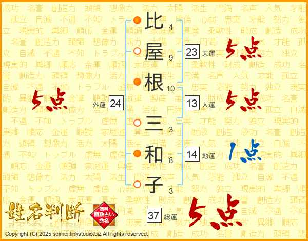 比(4画)屋(9画)根(10画) 三(3画)和(8画)子(3画)