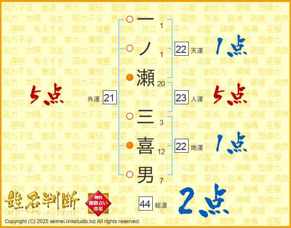 一(1画)ノ(1画)瀬(20画) 三(3画)喜(12画)男(7画)