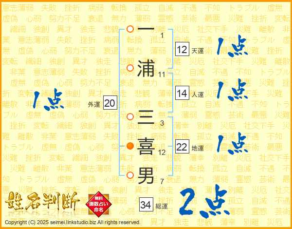 一(1画)浦(11画) 三(3画)喜(12画)男(7画)