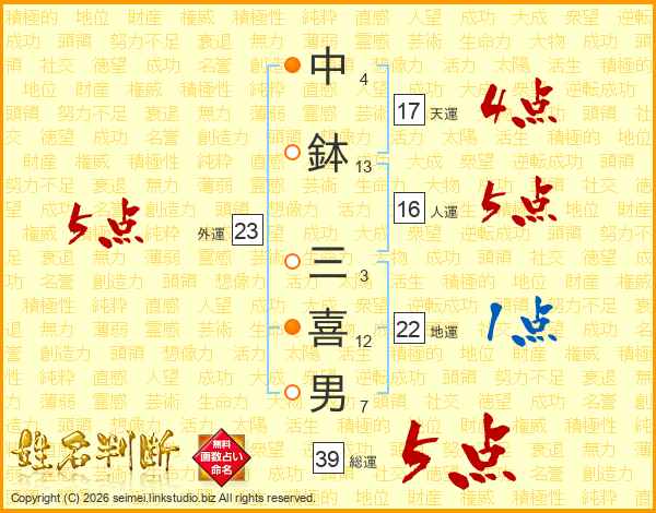 中鉢三喜男さんの総運は39画の5点!