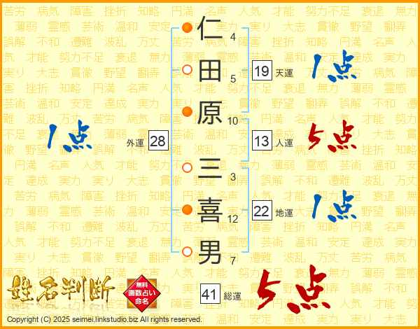 仁(4画)田(5画)原(10画) 三(3画)喜(12画)男(7画)