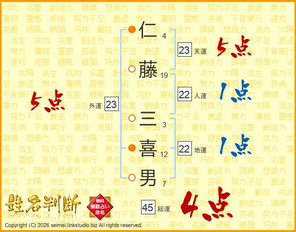 仁(4画)藤(19画) 三(3画)喜(12画)男(7画)