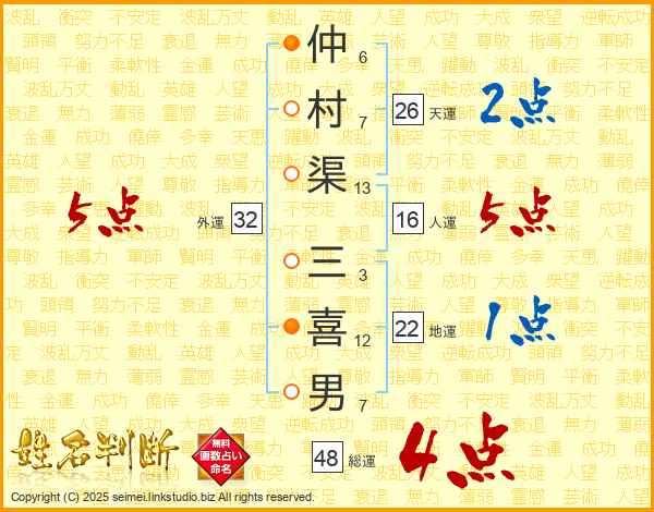 仲(6画)村(7画)渠(13画) 三(3画)喜(12画)男(7画)