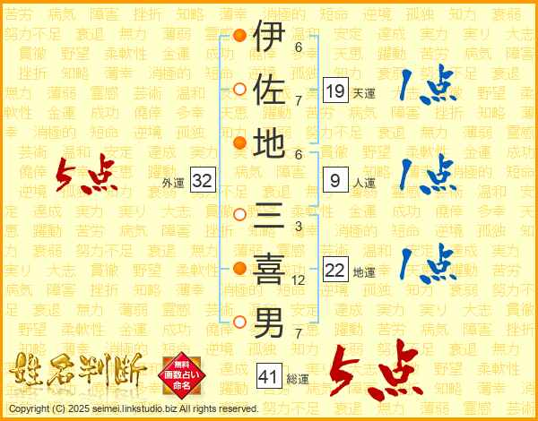 伊(6画)佐(7画)地(6画) 三(3画)喜(12画)男(7画)