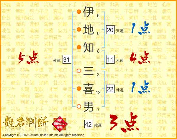伊(6画)地(6画)知(8画) 三(3画)喜(12画)男(7画)