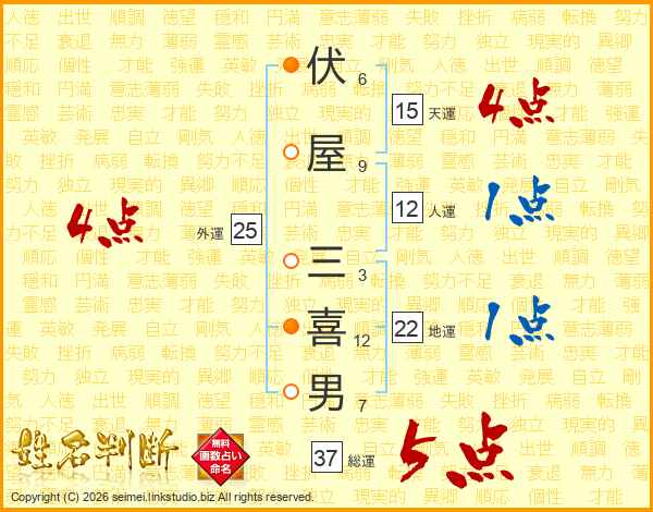 伏(6画)屋(9画) 三(3画)喜(12画)男(7画)