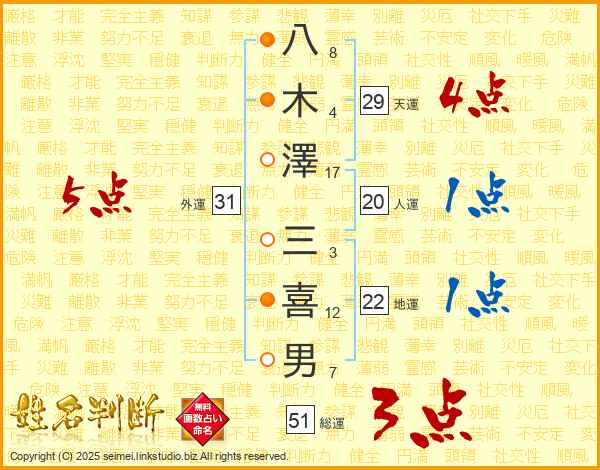 八(8画)木(4画)澤(17画) 三(3画)喜(12画)男(7画)