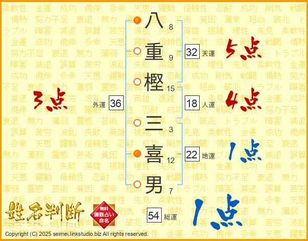 八(8画)重(9画)樫(15画) 三(3画)喜(12画)男(7画)