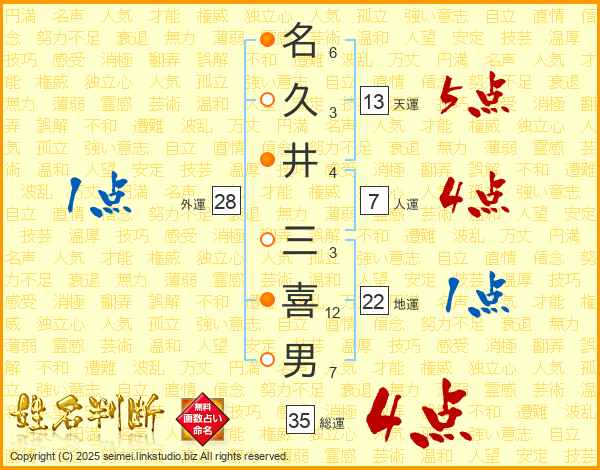 名(6画)久(3画)井(4画) 三(3画)喜(12画)男(7画)