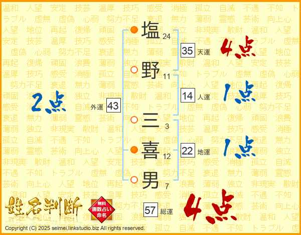 塩(24画)野(11画) 三(3画)喜(12画)男(7画)