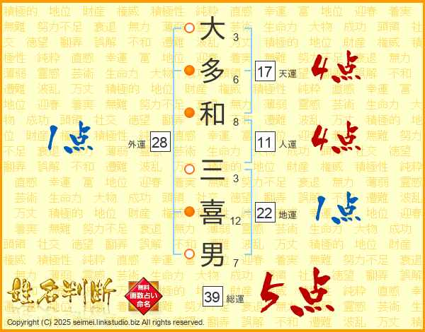 大(3画)多(6画)和(8画) 三(3画)喜(12画)男(7画)