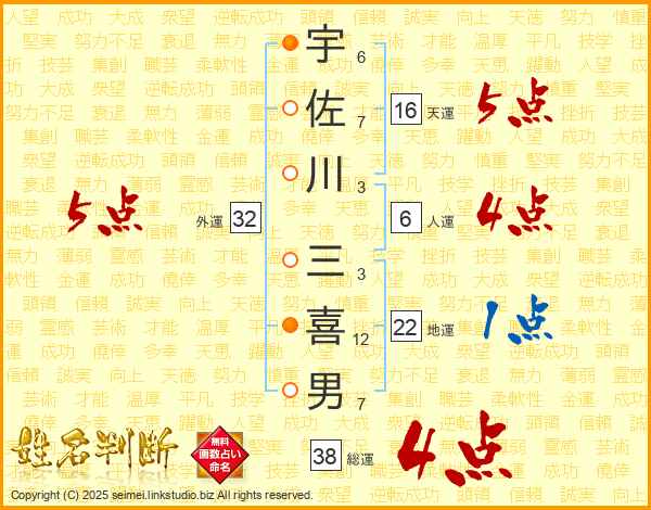宇(6画)佐(7画)川(3画) 三(3画)喜(12画)男(7画)