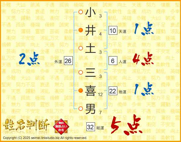 小(3画)井(4画)土(3画) 三(3画)喜(12画)男(7画)