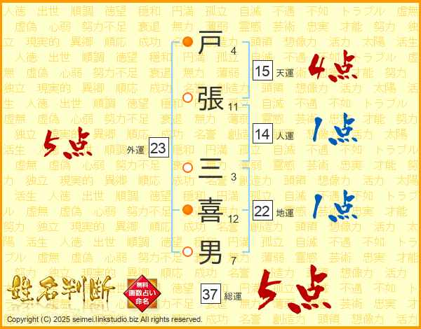 戸(4画)張(11画) 三(3画)喜(12画)男(7画)