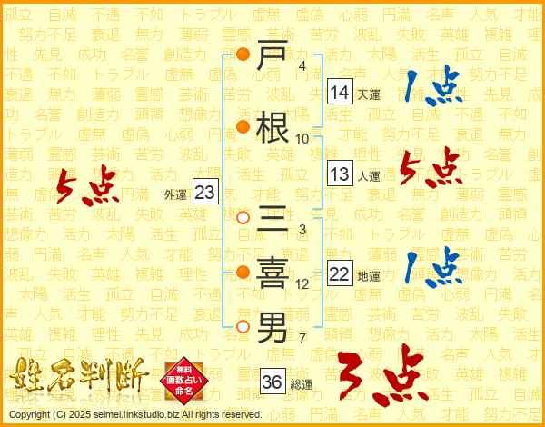 戸(4画)根(10画) 三(3画)喜(12画)男(7画)